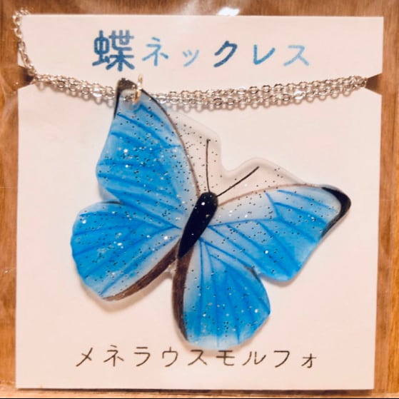◇ カナデミア特製オリジナル蝶デザインネックレス です。これは南米の美麗蝶の代表種 モルフォチョウをリアルに表現した デザイナーはるはな屋の渾身の製作品。送料税込み価格(寄付金¥300付)。